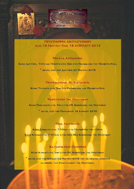 Πρόγραμμα Ακολουθιών από 18 Μαρτίου έως 18 Απριλίου 2019